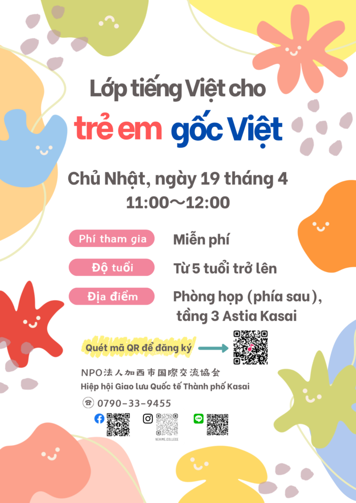 AboutKasai CityGlobal Center グローバルセンターについて 詳しく Services サービス Multilingual Consultation Service 多言語相談窓口 詳しく Japanese Language Classes にほんごきょうしつ 詳しく On-Site Japanese Language Lessons 出張日本語講習 詳しく Learning Support for Foreign Children 外国人児童学習支援 詳しく Support for Employers & Workplaces 外国人雇用·職場環境整備事業 詳しく Support for Employers & Workplaces 国際理解講座 詳しく International Exchange Programs 交流事業 詳しく VisitorInformation ご利用案内 詳しく Cultural Exchange through Food 食文化交流事業 詳しく